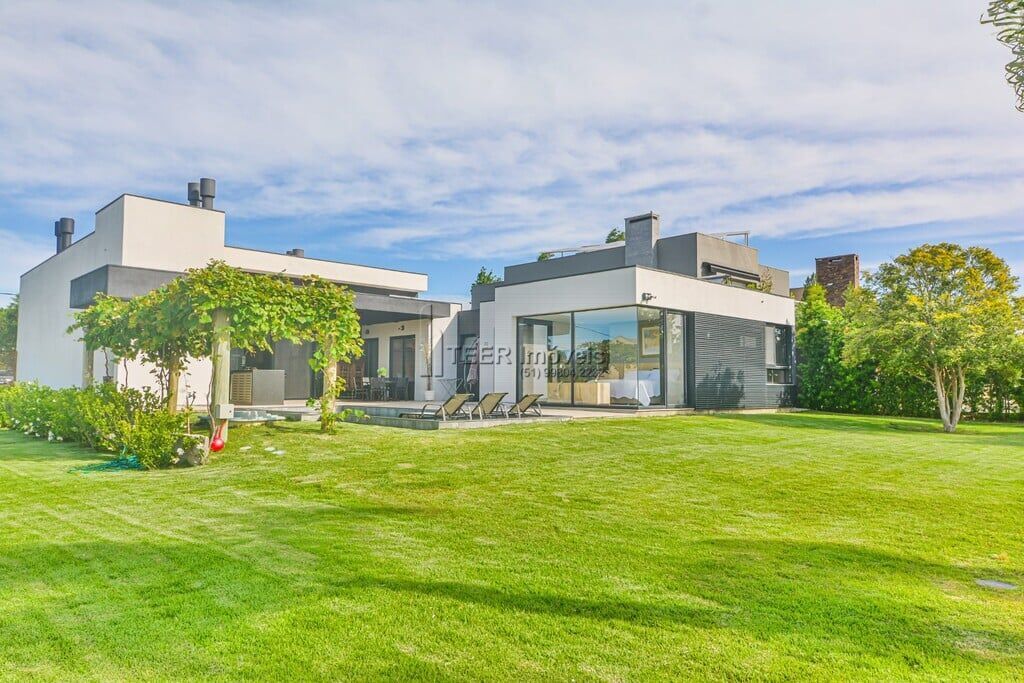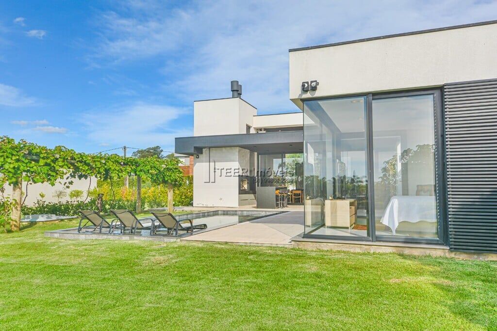 TEER Imóveis VENDE: Excelente casa térrea, estilo moderno, recém construída, 04 suítes, garagem coberta para 03 carros, piscina com aquecimento, com revestimento pedras vulcânicas, fundos lago e campo de golf, no Condomínio TERRAVILLE, em Porto Alegre. Casa térrea, muito bem ensolarada e ventilada, piso aquecido em toda a casa, 04 suítes, sendo a principal com amplo closet, estar /jantar com lareira, espaço gourmet com churrasqueira com espetos rotativos.